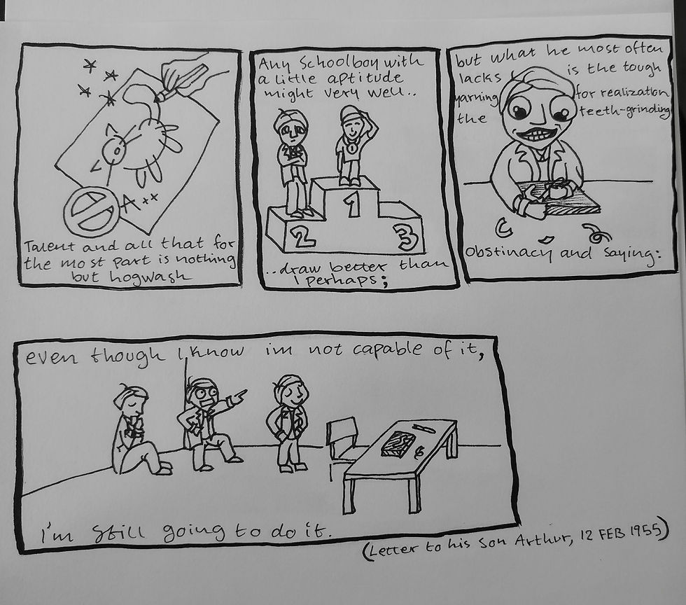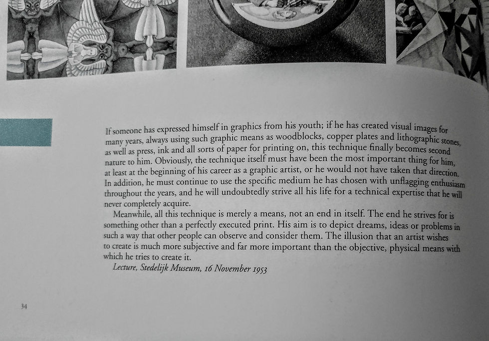 I boken - The magic of m.c escher, j.l locher finns det nästan bara citat, brev och föreläsningar som M.C Escher skrev. Tillsammans kan man få en ganska bra bild av honom och hans liv. Jag ville skapa en serie med fler rutor och försöka fånga dess innehåll genom att skapa bilder till dem. Under den här processen lärde jag mig mycket om konstnären och det förhållningssätt jag hade här, va att jag läste citatet, började skissa och skriva ner det. Sedan illustrera till texten. Första försöket så inkluderade jag inte alla delar av citatet utan bara de delar som var innehållsfulla, detta gjorde sedan att det blev svårt att läsa och förstå helt och hållet. Eftersom vi är vana vid att läsa på ett visst sätt. detta bevisar bara ytterligare hur viktigt relationen mellan text och bild är. Det som hände här va att jag läste, skrev det två gånger (först i skissen sedan i bläck), sedan bearbeta och reflektera över hur jag ska illustrera det för att till sist måla med bläck. Faktatexten bearbetades på så otroligt många sätt och det stöttade mitt minne.